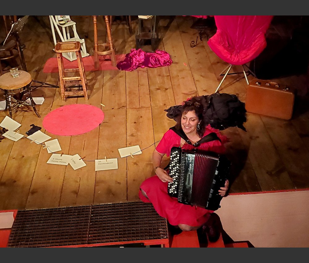 De toeschouwer herkent zichzelf, zonder twijfel, via de vertelling, via cabaret en Franse chansons. Langs het in- en uitademen van haar accordeon, qui fait vraiment partie de sa vie…, in een decor dat zo uit het “Paris des années folles” is geplukt. Waar ze lacht met zichzelf, in de stijl van Tine. Ontwapenend en ondeugend kan zijn. In de stijl van Tine. Waar ze iets te vertellen heeft, la Tine. Oui, oui, rozen bloeien, rozen verwelken, maar iedere roos is de moeite waard. Toch? Nee?